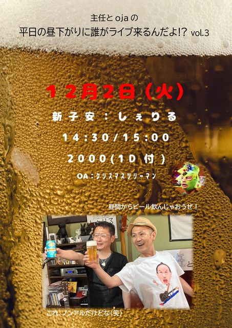 ¡ü³µÍ× £±£²·î£²Æü¡Ê²Ð¡Ë ¿·»Ò°Â¡§¤·¤§¤ê¤ë ¼çǤ¤Èoja¤Î¡ÖÊ¿Æü¤ÎÃë²¼¤¬¤ê¤Ë郎¥é¥¤¥ÖÍè¤ë¤ó¤À¤è!?¡×vol.3 OA¤¢¤ê¡ª 14:30/15:00 2000(1DÉÕ) ¡üÆâÍÆ oja¡Ê¤¢¤«¤¶¤ï¤µ¤È¤ë¡Ë¤È¤Î¥Ä¡¼¥Þ¥ó3²óÌÜ¡ª ¥¿¥¤¥È¥ë¤É¤ª¤ê¡¢Íè¤ì¤ë¿Í¤¤¤ë¤Î¤«¡©(^^;) ¢¨Á°²ó¤ÏËþÀÊ¡ª º£²ó¤ÏOA¤Ë¥¯¥ê¥¹¥Þ¥¹¥Ä¥ê¡¼¥Þ¥ó¤¬Åо졪 ¡ü¥¿¥¤¥à¥¹¥±¥¸¥å¡¼¥ë 15:00 °§»¢ 15:05 ¥¯¥ê¥¹¥Þ¥¹¥Ä¥ê¡¼¥Þ¥ó 15:20 oja 16:10 µÙ·Æ 16:20 ²¬ËܼçǤ 17:00 ޱŽÝŽºŽ°ŽÙ޾ޝ޼ޮŽÝ 17:10 ½ª±é ¡üÂǤÁ¾å¤²¡© ½ª±é¸å¤Ï¡¢¾ì½ê¤òÊѤ¨¤Æ¡Ê¿ʬ¥Ð¡¼¥ß¥ä¥ó¡Ë¤ÎÂǤÁ¾å¤²¤òͽÄꤷ¤Æ¤ª¤ê¤Þ