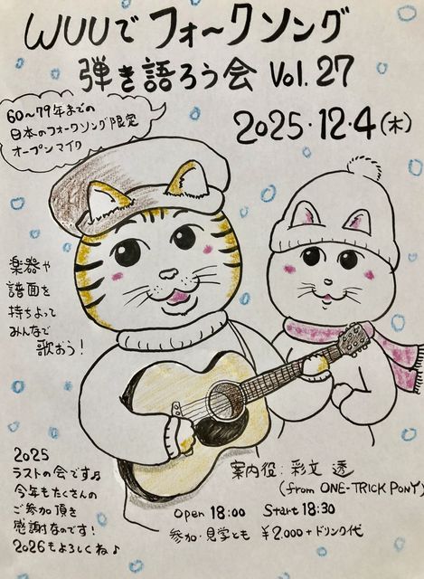 柏「Studio WUU」にての 「フォークソング弾き語ろう会」、 27回目がやってまいります! フォークソングを弾くのが好きなあなたも、 フォークソングを歌うのが好きなあなたも、 フォークソングを聴くのがすきなあなたも。 一緒に楽しみましょう! みなさま、よろしくお願いいたします。 ★2025.12.4(木) 柏「Studio WUU」★ https://www.wuu.co.jp/ 『WUUでフォークソング 弾き語ろう会 vol.27』 60〜70年代フォーク限定 楽器や譜面を持ち寄って みんなで歌おう! (1960〜1979年ま