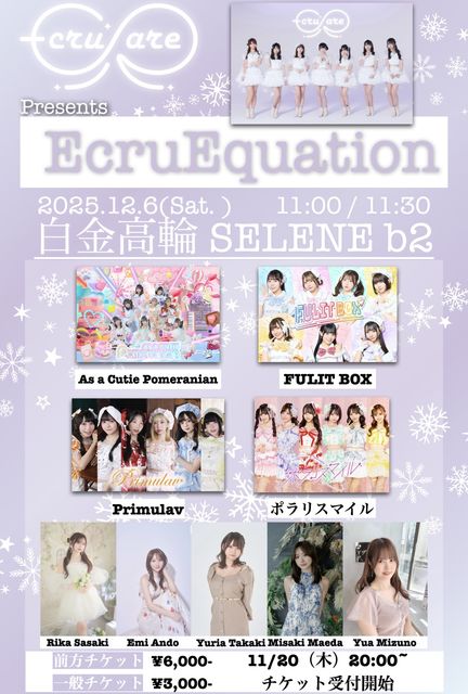 EcruRare Presents¡ÖEcruEquation¡× Æü»þ¡§12/06(ÅÚ) ³«¾ì 11:00 / ³«±é 11:30 ²ñ¾ì¡§Çò¶â¹âÎØSELENE b2 ÎÁ¶â¡§Á°Êý 6,000±ß / °ìÈÌ 3,000±ß (DÊÌ) ¥Á¥±¥Ã¥È¡§https://ticketvillage.jp/events/13616 Àè¹ÔÃêÁª 11·î20Æü(ÌÚ) 19:00¡Á11·î24Æü(·î) 23:59 °ìÈÌÀèÃå 11·î28Æü(¶â) 19:00¡Á ½Ð±é¡§EcruRare / FULIT BOX / As a Cutie Pomeranian / Primulav / ¥Ý¥é¥ê¥¹¥Þ¥¤¥ë / º´¡¹ÌÚÍþ²Ö / °ÂÆ£¾Ð / üâÌÚͳ轰¦ / Á°ÅÄÈþºé / ¿åÌî·ë°¦ ¢¨¤æ¤Ã¤Á¤ã¤ó¤ÎÆÃŵ²ñ¤¢¤ê¤Þ¤»¤ó¡£