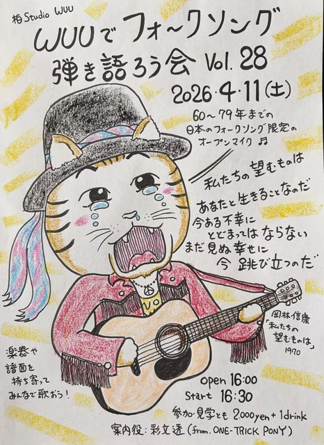 ★2026.4.11(土) 柏「Studio WUU」★ https://www.wuu.co.jp/ 『WUUでフォークソング弾き語ろう会 vol.28』 - 60〜70年代フォーク限定 楽器や譜面を持ち寄って みんなで歌おう! - (1960年から1979年までの 日本のフォークソング限定!) 案内役:彩文 透 (from ONE-TRICK PONY) Open 16:00 / Start 16:30 (いつもよりスタート時間が早いです) Charge 参加・見学とも ¥2000+ドリンク代