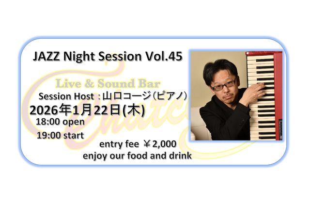 ホストプレーヤーにピアニストの山口コージ氏をお迎えしてのジャズセッションです。 ★毎月第4木曜日に開催!! ☆2026年1月22日(木) 18:00〜 OPEN ・19:00頃よりご参加状況を見てスタートします。 ・音出しは22:00までとなっております。 ◆参加費 ¥2,000 ※別途ご飲食をお願いいたします。 ◆ホストプレーヤー ピアノ 山口コージ セッションに参加ご希望の方は、リクエスト曲のコードとサイズ・進行等が分かる譜面をお持ちいただくとスムースに進められると思います。 もちろんリスナーとしてのご参加大歓