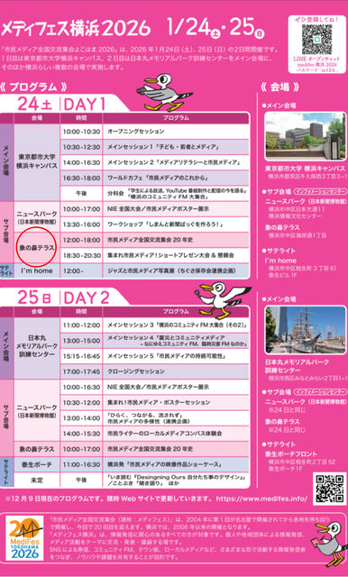 市民メディア全国交流会(メディフェス)が2006年ぶりに横浜が開催都市となりました。24日、25日と横浜各所で市民メディアのイベントが行われます。 その中で24日18時半〜象の鼻テラスで行う「集まれ市民メディア!ショートプレゼン大会&交流会」にてI LOVE YOKOHAMA【横濱】グループの管理人もお誘いを受けて登壇します。 映像あり、子育てサイトあり、プラチナ世代向けあり、SNS型超有名サイト、調査報道まで、かなり多彩な顔ぶれになっています。 こちらのサイトに詳しい情報を載せています https://medifes.info/zounohananight/ (順不