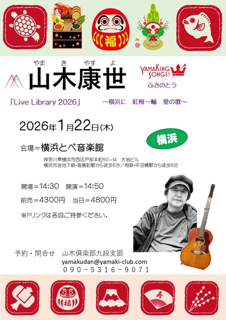 「山木康世 Live Lovely 2026」 〜横浜に 紅梅一輪 愛の歌〜 会場=横浜とべ音楽館 https://music-rental-studios.com/ 神奈川県横浜市西区戸部本町50−14 大岩ビル 横浜市営地下鉄・高島町駅から徒歩5分/相鉄・平沼橋駅から徒歩5分 開場=14:30 開演=14:50 前売=4300円 当日=4800円 ※ドリンクは各自ご持参ください。 予約・問合せ 山木倶楽部九段支部 yamakudan@yamaki-club.com 090−5316−9071
