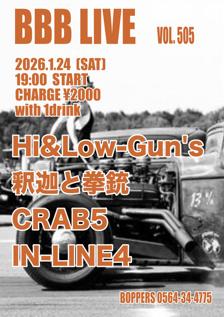 BBB LIVE 505 2026.1.24 (SAT) 19:00 START CHARGE \2000 with 1drink Hi&Low-Gun's 釈迦と拳銃 CRAB5 IN-LINE4