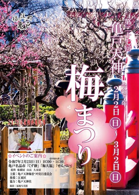 (管理人kaji-kajiさん了承済み) 東京都江東区の公園などをお散歩して 亀戸天神へ梅まつりを見に行きませんか。 日時、コースは下記になります。 -1.日程:2/14(土) -2.集合時間:12時半集合 -3.集合場所:東京メトロ 半蔵門清澄白河駅 清澄通り方面改札 改札口 (ホームの渋谷寄り階段を上がった先) -4.コース:清澄白河駅〜福富川〜木場公園〜大栄橋〜仙台堀川公園(西端)〜 浮橋〜北砂二丁目公園〜砂銀座商店街(自由行動あり)〜 東京大空襲戦災資料センター(入場料300円)〜