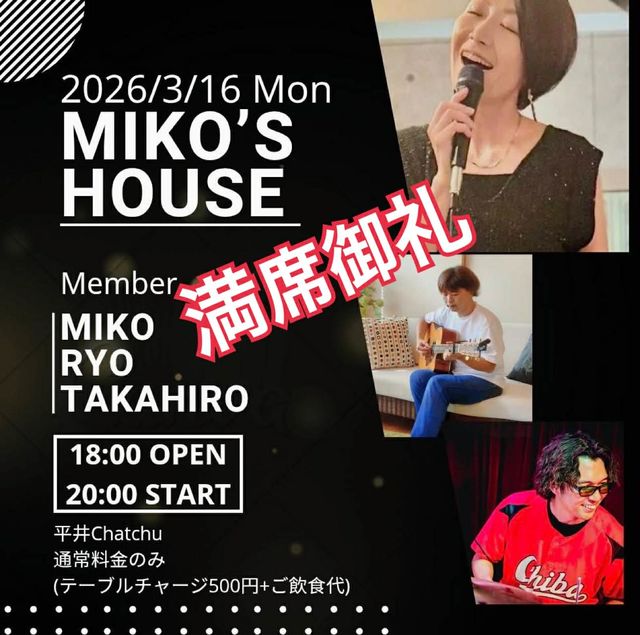 ※3/11更新 本イベントは本日満席御礼となりました。 ありがとうございます! 以降キャンセル待ちとさせて頂きます事ご承知おきください。 __________ 令和6年1月からスタートの新企画「miko's HOUSE」 旧友であるミュージシャン「カネコタカヒロ」氏が発起人となり、3名のホストメンバーにて毎月第3月曜日に開催いたします! 2026年3月16日(月) 平井 Chatchu 18:00 Open 20:00 Start TC 500円+ご飲食代 Member Vo. miko Gt. Ryo Drs. カネコタカヒロ