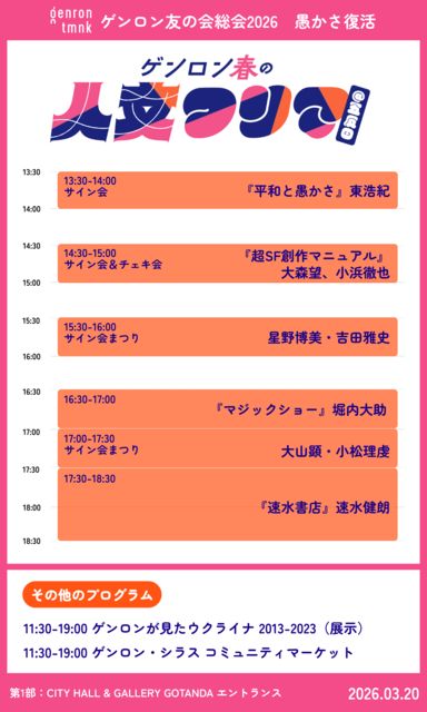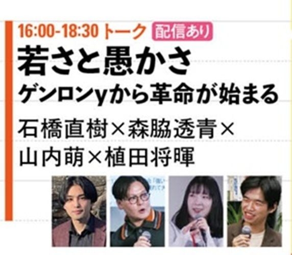 2026年3月20日(金・祝) ギャラリー 16:00-18:30:配信あり 山内萌×石橋直樹×森脇透青×植田将暉 若さと愚かさ——『ゲンロンy』から革命が始まる 会場 第1部:CITY HALL & GALLERY GOTANDA ゲンロンカフェ 25:00-27:00:配信あり 人文ウォッチ公開収録 山内萌×植田将暉 今週もSNSは愚かだった——人文ウォッチ公開生放送 会場 第2部:ゲンロンカフェ/シラススタジオ/特設バー会場 https://sokai.genron.co.jp/