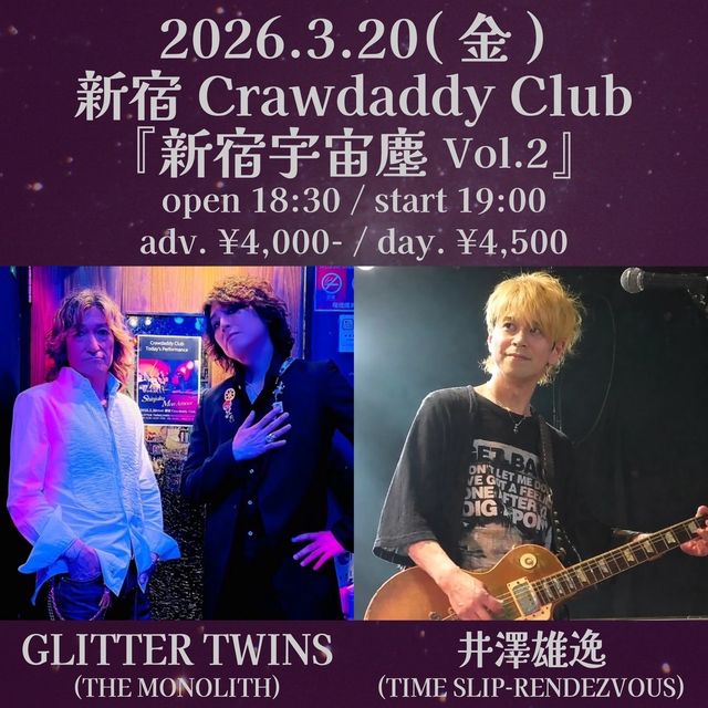 3/20 本日のライブ 『新宿宇宙塵 Vol.2』 OPEN 18:30 START 19:00 CHARGE adv\4000 / door\4500 act GLITTER TWINS (THE MONOLITH) 井澤雄逸 (TIME SLIP-RENDEZVOUS) よろしくお願いいたします!!