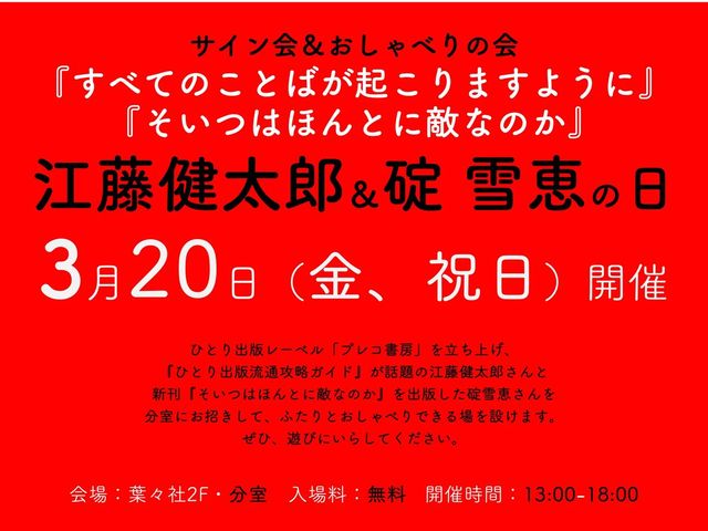 3/20(金、祝日)13時から 江藤健太郎&碇雪恵の日『すべてのことばが起こりますように』『そいつはほんとに敵なのか』サイン会&おしゃべりの会 葉々社(2F) https://youyoushabooks.stores.jp/