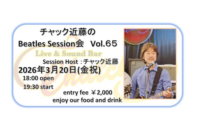 毎月第3金曜日開催のビートルズセッション! マニアック過ぎず、決めるところは決める! 一発合わせとは思えないほどのコーラスワークも必見必聴♪ 演っても観ても楽しいビートルズセッションですよ^^ セッションホストは「ビートルズサウンズ大研究」の著者でもお馴染みのチャック近藤氏! 時折かますダジャレもお聴き逃しなくww 2026年3月20日(金祝) Open:18:00 Session Time 19:30〜20:30 21:00〜22:00 Charge;2,000yen(要2オーダー) 皆様のご参加を心よりお待ちしております!
