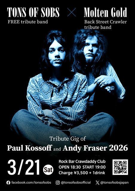 3/21 ËÜÆü¤Î¥é¥¤¥Ö¡¡ Tribute Gig of Paul Kossoff and Andy Fraser 2026 TONS OF SOBS and Molten Gold¡¡ OPEN 18:30 START 19:00 CHARGE 3500±ß¡¡ 19:00 Molten Gold¡¡ 20:10 TONS OF SOBS¡¡ ¤è¤í¤·¤¯¤ª´ê¤¤¤¤¤¿¤·¤Þ¤¹¡ª¡ª