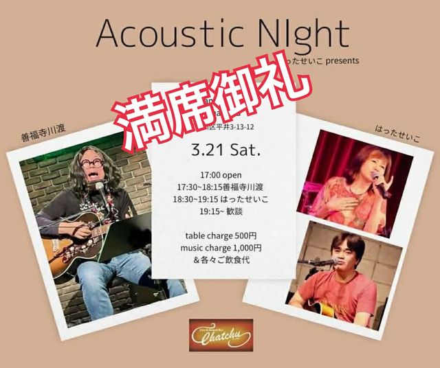 ¢¨3/11¹¹¿· ËÜ¥¤¥Ù¥ó¥È¤ÏËÜÆüËþÀʸæÎé¤È¤Ê¤ê¤Þ¤·¤¿¡£ ¤¢¤ê¤¬¤È¤¦¤´¤¶¤¤¤Þ¤¹¡ª °Ê¹ß¥¥ã¥ó¥»¥ëÂÔ¤Á¤È¤µ¤»¤ÆÄº¤¤Þ¤¹»ö¤´¾µÃΤª¤¤¯¤À¤µ¤¤¡£ ¡²¡²¡²¡²¡²¡²¡²¡²¡²¡² ¤Ï¤Ã¤¿¤»¤¤¤³¡Ê¾¾ÅÄÀ»»Ò¥¢¥³¥«¥Ð¡¼¡Ëpresents-Acoustic Night Vol.2³«ºÅ¤Î¤ªÃΤ餻¤Ç¤¹¡£ ºòǯ9·î¤Î½é²ó¤ÏÂçÀ¹¶·ËþÀʸæÎé¤È¤Ê¤ê¤Þ¤·¤¿¤Î¤Ç¡¢¤ª±Û¤·Äº¤±¤Ê¤«¤Ã¤¿¤ªµÒÍͤÏɬİɬ¸«¡ª¤è¤í¤·¤¯¤ª´ê¤¤¤¤¤¿¤·¤Þ¤¹¡£ ŹÆâ¥¥ã¥Ñ¥·¥Æ¥£¤ÎÅÔ¹ç¤Ë¤è¤ê15̾ÍͤÎÀèÃ头ͽÌóÍ¥Àè¤È¤µ¤»¤ÆÄº¤¤¤Æ¤ª¤ê¤Þ¤¹¡£ ¤´ÅÔ¹ç¤Ä¤¤Þ¤·¤¿¤é½Ð±é¼Ô¤µ¤Þ¡¢¤Þ¤¿¤Ï¥Á¥ã¥Ã¥Á¥åŹ¼ç¡¦µÈ¼¤Þ¤Ç¥á¥Ã¥»¡¼¥¸Åù¤Ç