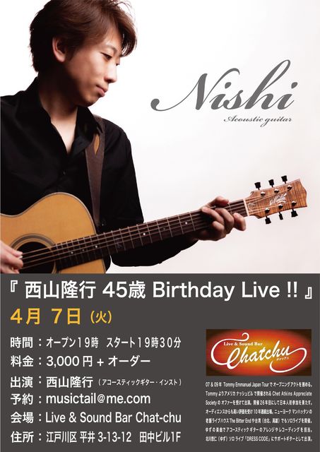 ¡Ø À¾»³Î´¹Ô 45ºÐ Birthday Live !! ¡Ù ¡¦4·î7Æü¡Ê²Ð¡Ë Live & Sound Bar Chat-chu »þ´Ö¡§¥ª¡¼¥×¥ó£±£¹»þ¡¡¥¹¥¿¡¼¥È£±£¹»þ£³£°Ê¬ ÎÁ¶â¡§£³,£°£°£°±ß + ¥ª¡¼¥À¡¼ ½Ð±é¡§À¾»³Î´¹Ô¡Ê¥¢¥³¡¼¥¹¥Æ¥£¥Ã¥¯¥®¥¿¡¼¡¦¥¤¥ó¥¹¥È¡Ë ͽÌó¡§musictail@me.com ½»½ê¡§¹¾¸ÍÀî¶è Ê¿°æ 3-13-12¡¡ÅÄÃæ¥Ó¥ë1F --- #¥Ð¡¼¥¹¥Ç¡¼¥é¥¤¥Ö #¹¾¸ÍÀî¶èÊ¿°æ #NishiÀ¾»³Î´¹Ô