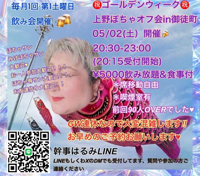 5/2(ÅÚ)20:30~23:00(20:15~¼õÉÕ³«»Ï) 70̾Á°¸å¤ÇÄùÀÚ¤·¤Þ¤¹¤Î¤ÇÁá¤á¤Î¤´Ï¢Íí¤ª´ê¤¤¤·¤Þ¤¹(ÅöÆü¤ªÅ¹¤ÎÀʤ¬¶õ¤¤¤Æ¤ì¤Ð¿Í¿ô³ÈÂ礷¤Þ¤¹) ¸æÅÌÄ®±Ø1ʬ¤Î·¤¤Ï椬¤Ê¤¤¥Æ¡¼¥Ö¥ëÀʤΤªÅ¹¤Ç¤¹¡ª ¥É¥ê¥ó¥¯¤Ï¥»¥ë¥Õ¤Ç¤Ï¤Ê¤¯µï¼ò²°¤µ¤ó¤Ç¤ÎÉáÄ̤ΰû¤ß²ñ¤Ç¤¹¢ö ½é¤á¤Æ»²²Ã¤¹¤ëÊý¤â¤³¤Îµ¡²ñ¤ËÀ§È󤤤餷¤Æ¤ß¤Æ¤¯¤À¤µ¤¤¢ö ¤Þ¤¿µ×¤·¤Ö¤ê¤ÎÊý¤ä¤è¤¯Íè¤Æ¤¯¤À¤µ¤ëÊý¤âÀ§ÈóÍ·¤Ó¤ËÍè¤Æ¤¯¤À¤µ¤¤(^^) ¤½¤·¤ÆÁ°²ó5/2(ÅÚ)¿·Ç¯°û¤ß²ñ¤Î¸å½ñ¤¤Ç¤¹¤¬92̾¤ÎÊý¤¬Íè¤Æ¤¯¤À¤µ¤¤¤Þ¤·¤¿¢ö ¤¤¤Ä¤â¿¤¯¤Î»²²Ã¼ÔÍÍ¡Á¤¢¤ê¤¬¤È¤¦¤´¤¶¤¤¤Þ¤¹(^^) ¤¦¤Á¤Î¥ª¥Õ²ñ¤Ï·î1²ó(Âè1