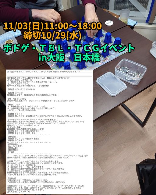まだ始めたばかりで少人数ですが参加メンバー募集しております('◇')ゞ よろしくお願いしますm(__)m 11月はまだまだ【コリドール】を擦ります(; ・`д・´)v 2人〜4人用ゲームです。 他ゲームも希望が有れば行います!!(20種類程) 【日付】11/02(日)13:00〜18:00 【締切】11/29(水) 開催最低人数4人…開催決定した際はご連絡差し上げます。 【場 所】〒542-0072 大阪市中央区高津3-1-1 シティアーク下寺町ビル4F ラグランジュポイント内 【料金・コース】 A:飲み放題付…¥220(ソフトドリンク) B:冷製緑茶:冷製