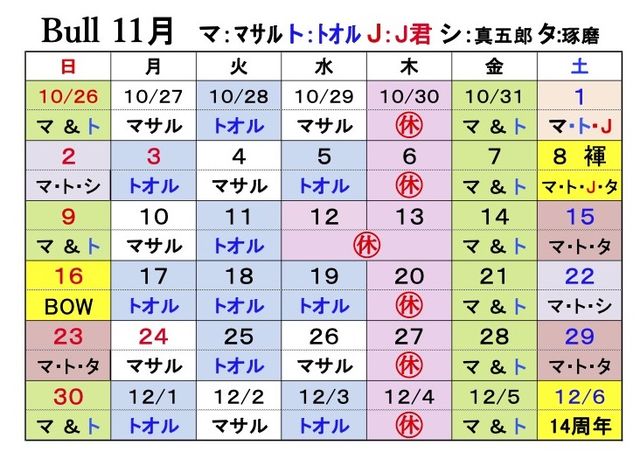 11月予定 ようやく寒くなり秋飛ばしての初冬ですね。 ☆ 褌Day  11月8日(土)17時から21時まで褌オンリーです。 ※ 21時からは通常営業です。 ☆ Bull ボウリング大会   11月16日(日)   13時30分受付    14時スタート 3ゲーム   終了後懇親会予定 参加者募集中 ☆ お休み   定休日木曜:6日・20日・27日   お店休み :12日(水)13日(木) ☆ 14周年感謝祭   12月6日(土)19時〜   軽食あり、飲み放題、歌い放題 ☆ Bull Tシャツ販売中  お店で聞いてね! 霜月に入り急