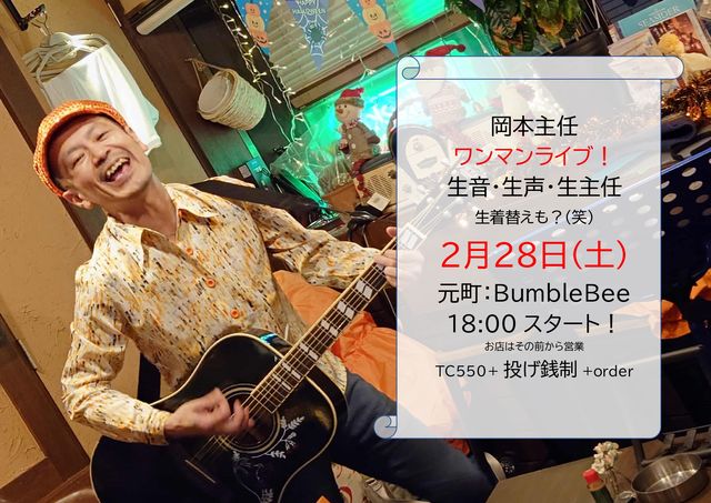 ●概要 2月28日(土) 元町:BumbleBee https://yokohama-motomachi-cs.com/shop/304/ 岡本主任ワンマンライブ/生音・生声・生主任! 18:00スタート! ※お店はその前から営業 TC550+投げ銭(+オーダー) ●内容 岡本主任としては超珍しい!生ギター&生音によるライブ! ※現在ここだけです。生着替えも?(笑) 2部構成。全体的に静か目の曲多めか?そんなことはないか?(笑)。 ●タイムスケジュール 第一部 18:00-18:45 第二部 19:00-19:45 その後、飲み会?(笑)