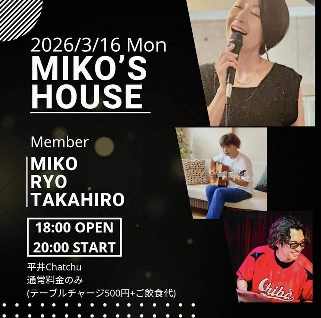 ÎáÏÂ6ǯ1·î¤«¤é¥¹¥¿¡¼¥È¤Î¿·´ë²è¡Ömiko's HOUSE¡× µìͧ¤Ç¤¢¤ë¥ß¥å¡¼¥¸¥·¥ã¥ó¡Ö¥«¥Í¥³¥¿¥«¥Ò¥í¡×»á¤¬È¯µ¯¿Í¤È¤Ê¤ê¡¢3̾¤Î¥Û¥¹¥È¥á¥ó¥Ð¡¼¤Ë¤ÆËè·îÂè3·îÍËÆü¤Ë³«ºÅ¤¤¤¿¤·¤Þ¤¹¡ª ¥«¥ì¥ó¥À¡¼ 2026ǯ£³·î£±£¶Æü¡Ê·î¡Ë ²è¤Ó¤ç¤¦ Ê¿°æ Chatchu »þ·×(6»þ) 18:00 Open »þ·×(8»þ) 20:00 Start ¥É¥ëÂÞ TC 500±ß¡Ü¤´°û¿©Âå ¥«¥é¥ª¥± Member Vo. miko Gt. Ryo Drs. ¥«¥Í¥³¥¿¥«¥Ò¥í »þ·× ¥¿¥¤¥à¥Æ¡¼¥Ö¥ë 20:00¡Á20:30 »°³Ñ(±¦) ¥ß¥ËLIVE 20:30¡Á22:00 »°³Ñ(±¦) Session ²»³Ú¤òݤ¤¤Æ¡¢»²²Ã¤·¤Æ¡¢¤ß¤ó¤Ê¤Ç³Ú¤·¤á¤ëÌë¤Ç¤¹¤Ô¤«¤Ô¤«¡Ê¿·¤·¤¤¡Ë ½é¤á¤Æ¤ÎÊý¤â