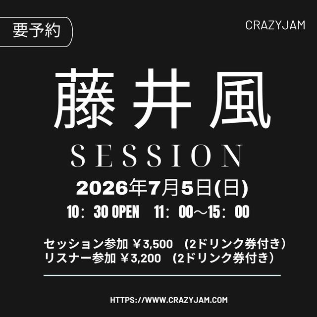 Æ£°æÉ÷¥»¥Ã¥·¥ç¥ó¡¡³«ºÅ¤·¤Þ¤¹¡ª¡ª¡ª ¤ªÍ¶¤¤¤¢¤ï¤»¤Î¾å¤´»²²Ã¤¯¤À¤µ¤¤¡£ ¡ú¡úÂè11²ó Æ£°æÉ÷¥»¥Ã¥·¥ç¥ó¡ú¡ú ¡¡Æü»þ¡¡2026ǯ 7·î5Æü¡ÊÆü¡Ë¡¡10¡§30¥ª¡¼¥×¥ó 11¡§00¥¹¥¿¡¼¥È¡Á15¡§00 ¡¡²ñ¾ì¡¡Î©Àî CRAZY JAM ¡¡¡¡¡¡¡¡http://www.crazyjam.com ¡¡»²²ÃÎÁ¶â¡¡¡ï3,500¡Ê£²¥É¥ê¥ó¥¯·ôÉÕ¡Ë ¡¡¸«³ØÎÁ¶â¡¡¡ï3,200¡Ê£²¥É¥ê¥ó¥¯·ôÉÕ¡Ë ÂǤÁ¾å¤²¡¡¡ï2,000¡¡(1drink¡¢¥Õ¡¼¥ÉÉÕ¤) ¡¡¥Û¥¹¥È¡¡¥Ï¥»¤Ô¤£¡ÊKey.¡Ë¥à¥é¥·¥Þ¥ó(Gt.) ¡¡¿Ê¹Ô¡¡CRAZY JAM¥¹¥¿¥Ã¥Õ ¡¡ ¡¡¢¨¹â¹»À¸°Ê²¼¤Î¤´»²²Ã¤Ï¡¢Êݸî¼Ô¤ÎƱȼ¤¬É¬ÍפǤ¹¡£ »²²Ã¼Ô°ìÍ÷ https://docs.g