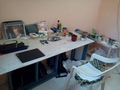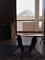 部屋替えを待っていても埒があかないようなので、あれこれと「長期滞在用アレンジ」を実施・・14年と同じくシングルベッドの片方を横倒しにして作業用デスクを構成した。洗濯ロープを展張し、神札と美代ちゃん写真をお祭りして一応完成・・・こうなってみれ
