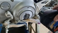#ハーレー に現物合わせで装着していた車種不明のオンボロシングルシート、ヤフオクで同メーカーと思われるシートを480円で落札!再び現物合わせで装着!台座が二股に割れてなくて、サンダーで削りまくり!雨でスポンジが濡れるのを避ける為にタイヤチューブ