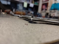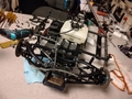 シャーシー交換を始める全バラして点検、掃除、部品交換なので手間と時間がかかるまず、全バラ開始これは手慣れたものですぐにバラバラ単品になったシャーシーを平坦なところに置いてみる驚いた!予想以上のエビさんだった前後方向は真ん中が接地して前後は「