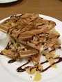 たらふく食った後にも関わらず、いつもの英國屋・ホワイティうめだ イーストモール扇町でデザート類をオーダーする面々。私が頼んだのはモンブランワッフル。とはいえ、モンブランの証である、冠雪を模したパウダーシュガーはなし。ダメじゃん…
