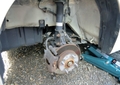 HONDA N-BOX整備は続きます。下から覗いたら初期製造の裸足回りが凄い。ジャッキを当ててホイールを外します。トルクが140N位で締められていました。うちのトルクレンチは130N位なので振り切っても緩みませんでした。速太郎車検の時に錆びの状況を聞いたら「