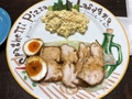 一昨日つくって残った鶏胸肉焼豚風と半熟煮玉子、その汁と鶏肉を煮たスープでラーメンつくりました