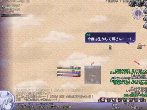 右へ右へとスイスイ進んでいくと、わずか数分で魔王が降臨します。魔王は定期的に勇者の前に立ちはだかっては数ターンで帰宅する存在です。当然、冒険を始めたばかりのお前では完全に勝算がないため、アイテムやスキルなどさまざまな「逃げるための手段」をあらかじめ確保しておき、切り抜けなければなりません。