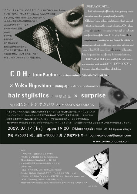 COH PLAYS COSEY deals with concepts of honesty, trust, privacy, communication as well as (perception of) sexuality. COH plays Cosey without inhibitions, without fear and without questioning the content submitted. COH plays Cosey like an actor - becoming her through his elaborate transformations of the voice. COH plays Cosey like a computer game - making his way though the infinite combinations and variety of human _expression with ease and sense of fun. COH plays Cosey like in sex - fully controlling the process and manifesting the eventual outcome. COH PLAYS COSEY & MECONOPSIS is a world of the embarrassingly unspoken made audible, COH PLAYS COSEY & MECONOPSIS is the place where there is nothing left to hide.