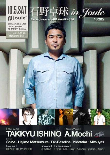 名実共に日本トップに君臨する 石野卓球(電気グルーヴ) をメインDJに迎える大阪が誇るNo.1テクノパーティ「TAKKYU ISHINO IN JOULE」が10月5日(土)に開催決定!今回はUKより世界最高峰との呼び声が高いサウンドシステムVOID acousticsと、先日行われたWIRE2013でも大好評だったA.MOCHIによるLIVE出演を追加、SENCE OF WONDERによるレーザーワークも前回よりパワーアップし、関西最高峰のショーが実現。より一層進化する大阪・秋のモンスターパーティを体感せよ。