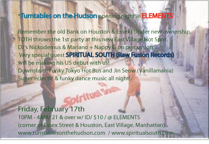 "Turntables on the Hudson" and "Funky Tokyo Hot Bus" welcome London's modern jazzier, Spiritual South (Raw Fusion Records) on next Friday, 17th! This is his exclusive NYC debut, so expect his global electric jazz sessions. ...Future Worldwide Massive for sure!!! We also celebrate an opening night of new club "Elements" (the old bank, you remember? a corner of Houston and Essex st). Of Course, TOTH's "Nickodemus and Mariano along with Nappy G (on percussion)" will bring extra spicy funky dance music on floor. Plus Plus plus, Funky Tokyo Hot Bus and NYC's own "Jin" from Vanillamania will give super eclectic wonderland on downstairs...