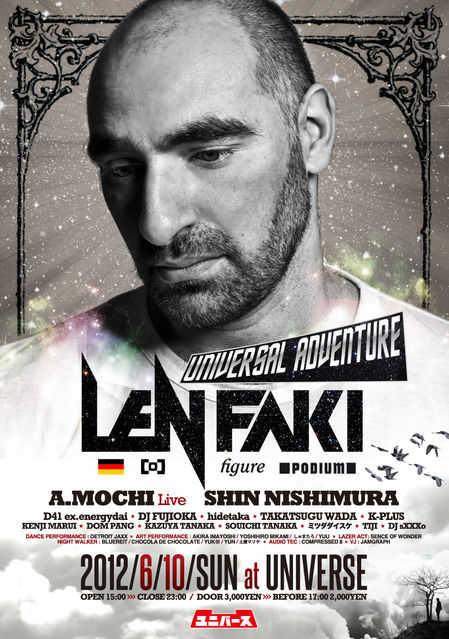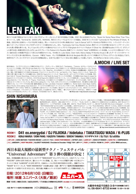 [ SOUND ACT / MAIN STAGE ] LEN FAKI ( from BERLIN / FIGURE ) A.MOCHI ( from TOKYO / FIGURE ) SHIN NISHIMURA ( PLUS RECORDS ) D41 ex.energydai ( teiONclub Entertainment ) DJ FUJIOKA ( teiONclub Entertainment ) hidetaka ( teiONclub Entertainment ) TAKATSUGU WADA ( teiONclub Entertainment ) K-PLUS ( O-PLUS )