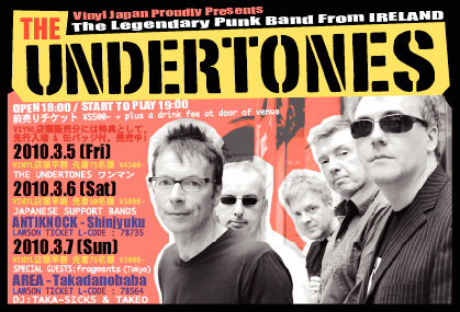 " THE UNDERTONES " 3月6日 ( SAT ) 新宿ANTI-KNOCK 3月7日 ( SUN ) 高田馬場AREA open : 18:00 / start to play : 19:00 前売TICKET : \5500 ( plus one drink fee at the door / venue ) VINYL JAPAN2号店で購入された方のみ特典:先行入場 & PIN BADGE付き ローソンチケットでも ON SALE NOW ( L CODE 6日 78735 / 7日 78564 ) Japanese support bands MAR 06 to be announced soon. MAR 07 JUNIOR / fragments ( tokyo )