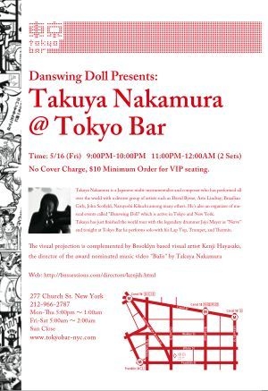 世界中をツアーするマルチ・ミュージシャン、中村卓也氏が今週金曜日にトライベッカのTokyo Barにてラップトップ、トランペット、テルミンを使ったソロパフォーマンスを行ないます。