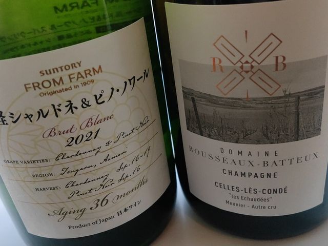 ワインリスト;人数により変更があります。ご承知おきください 2021 Suntory From Farm 津軽シャルドネ&ピノ・ノワール スパークリング <差し入れ> N.V. Rousseaux-Batteux Celles-les-Conde 'Les Echaudees' Champagne Extra Brut 2021 Matt Taylor Wines Komorebi Chardonnay, West Sonoma Coast 2020 Matt Taylor Wines Cuvee Kaela Pinot Noir, West Sonoma Coast 2018 Foradori Granato, IGT Vigneti delle Dolomiti 他(白)