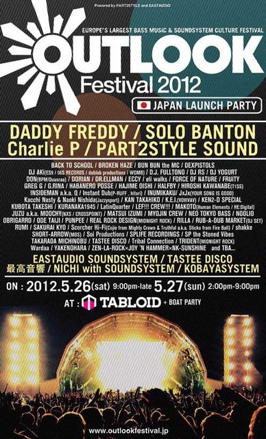 クロアチアで毎年開催されているベース・ミュージックの祭典、OUTLOOK FESTIVAL のローンチ・パーティーが、 昨年に引き続き日本でも開催する事が決定!! OUTLOOK FESTIVAL2012がクロアチアにて8月31日から4日間の開催に向け、世界各国でローンチ・パーティーが行われる。 ここ日本では 昨年に引き続き東京浜松町のTABLOID で5月26日(土)、27日(日)の2日間。 世界中のローンチ・パーティーの中でも日本は最大規模。 このOUTLOOK、従来のフェスやパーティーとの違いはREGGAE、DUB、DUBSTEP、JUNGLE、DRUM N BASS等のベース・ミュージックが主体にありその周辺のジャンルに必要不可欠なサウンドシステムによる圧倒的な「音圧」が最大のウリであり、ヨーロッパのシーンでは当然のことではあることだが、ここ日本ではまだ馴染みがない。「ベース・ミュージックは聴くモノではなく体感するモノ」という言葉を掲げ、昨年末TABLOIDにて開催された「SOUND SLUGGER」でオーディエンスにその言葉を証明した。今回のパーティーでベース・ミュージックの真髄をこのパーティーを通して日本に! 世界基準のクオリティを体が覚えたらいままでの音響では物足りなくなる筈! 染みがない。「ベース・ミュージックは聴くモノではなく体感するモノ」という言葉を掲げ、昨年末TABLOIDにて開催された「SOUND SLUGGER」でオーディエンスにその言葉を証明した。今回のパーティーでベース・ミュージックの真髄をこのパーティーを通して日本に! 世界基準のクオリティを体が覚えたらいままでの音響では物足りなくなる筈!