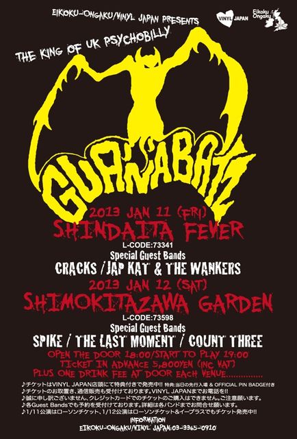 英国音楽/VINYL JAPAN presents the king of UK psychobilly 【GUANA BATZ】 2013 Jan 11 (fri); 新代田FEVER Special Guest Bands: CRACKS / JAP KAT & THE WANKERS ローソンチケット L-CODE:73341