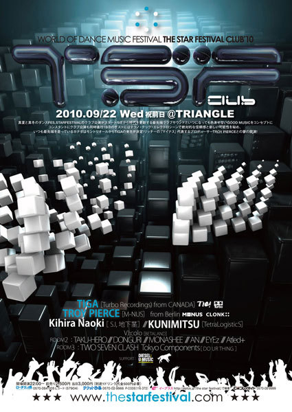 真夏と真冬のダンスFES,THE STAR FESTIVALのクラブ公演がスタート! 9月から 時代を更新する最先端クラブサウンドといつになっても色あせないGOOD MUSICをコンセプトとしコンスタントにクラブ公演も同時進行! 今回は、テクノ・テック・エレクトロシーンで絶対的な信頼感と新しい可能性を秘めいつも最先端を走っているカナダからTIGAの来日が決定! リッチー率いるM-NUSを代表するプロデューサーTROY PIERCEと夢の競演でお贈りします!