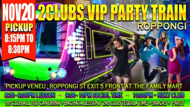 We will visit 2 different Bars / Clubs with BACHATA LESSONS included and All you can drink ! as we go to get us in the Latin party mood . In Tokyo Every club has a cover charge of between 1500 yen to 2500 yen but by joining us on our party train we will have ENTRANCE to 2 clubs.
