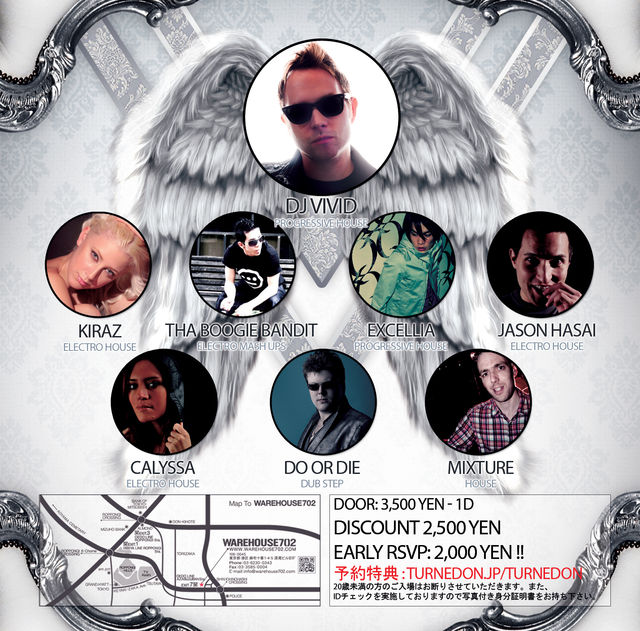 TURNED ON TALENT further pushes the Turned On sound with a roster of artists with unique skills and talents that continues to keep them busy every weekend. Leading the charge is DJ Vivid; with a rich history in Tokyo's club scene, busy international Dj schedule and a stream of music releases, Vivid continues to make strides in the Tokyo EDM scene. Vivid is joined by: Kiraz and Calyssa, two of the leading foreign female Djs in Japan with non stop DJ bookings. Jason Hasai: A true music head with his heart in the Tokyo Underground. Do or Die: A leader in the Dub Step scene, with a sound that few club systems can handle. Tha Boogie Bandit: A true Mash Up artist, who surprises his followers with every set. Mixture: A pirate radio legend with a real passion for deep funky house. And Excellia Tokyo's upcoming Progressive House producer and dance floor destroyer.