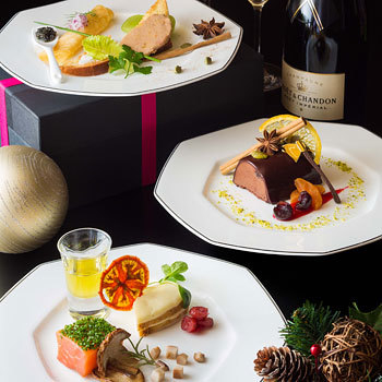The Champagne Elegance - フランス産鴨フォアグラのグリル、スターアニス風味のライチソース - カボチャバンズでつくったクラシックなスモークサーモンサンド - アップルパイにホイップクリームを添えて