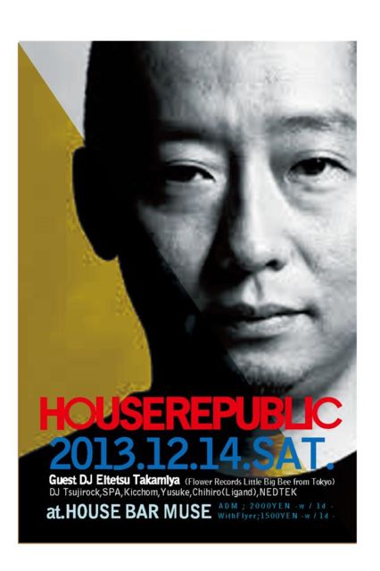 いつもの常連さんも、まだMUSE未体験の方も、皆様のご来場お待ちしております! HOUSE MUSIC connected from MUSE … ――――――――――――――― HOUSE REPUBLIC @ House Bar MUSE (大阪西天満) 2013.12.14(sat) 21:00-LATE Door :¥2,000 With Flyer :¥1,500(With / 1 Shot Jägermeister) フライヤー画像をエントランスで見せて頂くと ¥1,500(with 1 shot Jägermeister)で入場可能。 Jägermeisterは1杯 ¥200とお得なセット6杯 ¥1,000でエントランスで絶賛販売中!!!