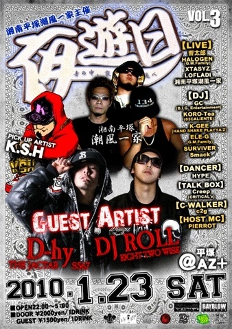 《DJ ROLL Profile》 15才の時にHIP HOPやR&Bなどの音楽に魅了され、BLACK MUSICを聴いていく中でUP IN THE SMOKEのVIDEOと出会い、WEST COASTの文化の扉を開く。 ターンテーブルを持っていた事からレコード収集を始め、2004年からDJを本格的に開始。 2006年からは地元の仲間とEIGHT TWO WISEを結成し相模原を拠点に活動!! レコードを愛し、あくまでもGANGSTA RAPにこだわり抜くプライドを胸に、フロアの空気に合わせたグルーブのある選曲にスクラッチを織り交ぜ、オーディエンスを揺らす! オールマイティーにこなす柔軟なPLAY STYLEで仲間からも絶大な信頼を得ているDJである。