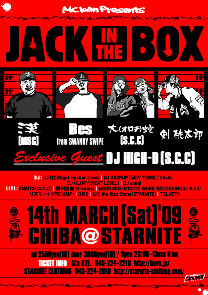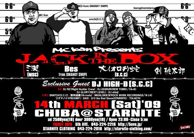 SNATCH(S.C.CREW) SEED ENTERTAINMENT 房州達磨(Hi-roots) MIGALSKIE(B'ROCK WORK RECORDINGS) N-14 リズマノイドPB(KMP) DAiS G:O the Red Stone(STARNITE) TOLAETH DJ NZ (Night Hustler Crew) / DJ GLORY(NEXT LEVEL)