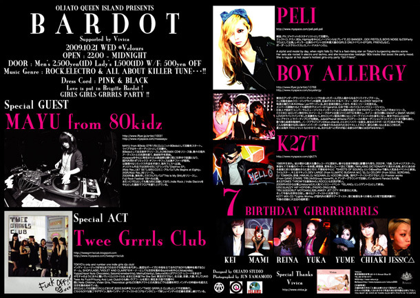 OLJATO×QUEEN×ISLAND Presents New style party『 B A R D O T 』 that loves Brigitte Bardot who has been popular actress since 1960’s . A lot of strong and Glamorous female artists and TOKYO FASHIONISTAS brilliant join the party !! It will be excited DANCING PARTY by famous GIRLS DJS!! LET' S DANCING DANCING !!