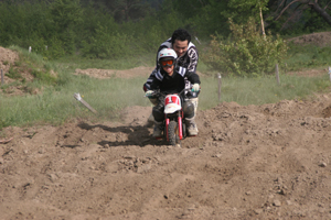 石打丸山の広い駐車場でオフロードバイク「モトクロス体験乗車」も体験!モトクロスは50ccバイクを利用し安全を考慮して10km以下走行設定をしてあります。