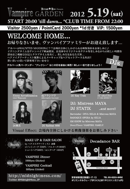 ・DJ ZINNY AERODINAMICA(Club Walpurgis) aka. Zin-François Angéliqe(Vo. of Madame Edwarda) Gothic / Bat Cave / Deathrock / Dark Wave / EBM / etc. http://www.clubwalpurgis.com/ *co-founder & ex.resident DJ of Midnight★Mess