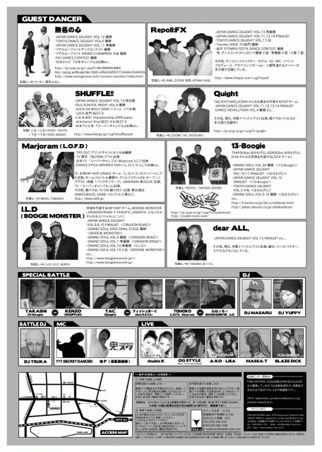 ━ SHUFFLE!! ━ ・JAPAN DANCE DELIGHT VOL.13 特別賞 ・OLD SCHOOL NIGHT VOL.8 優勝 ・JUSTE DE BOUT 2006 フランス・パリ本戦LOCK部門 BEST 8 ・U.K B-BOY championship 2006 japan elimination final BEST 4 & BEST 8 ・日本テレビ系『スーパーチャンプル』出演 etc... http://www.freepe.jp/i.cgi?shufflestyle